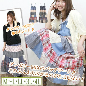 このふんわりフレアーがたまらない!カントリーなパッチワーク☆【KY】【Mサイズ・Lサイズ・LLサイズ・3Lサイズ・4Lサイズ(フリーサイズ)】ダンガリーMIXでトレンドGET!春の★パッチワークワンピ